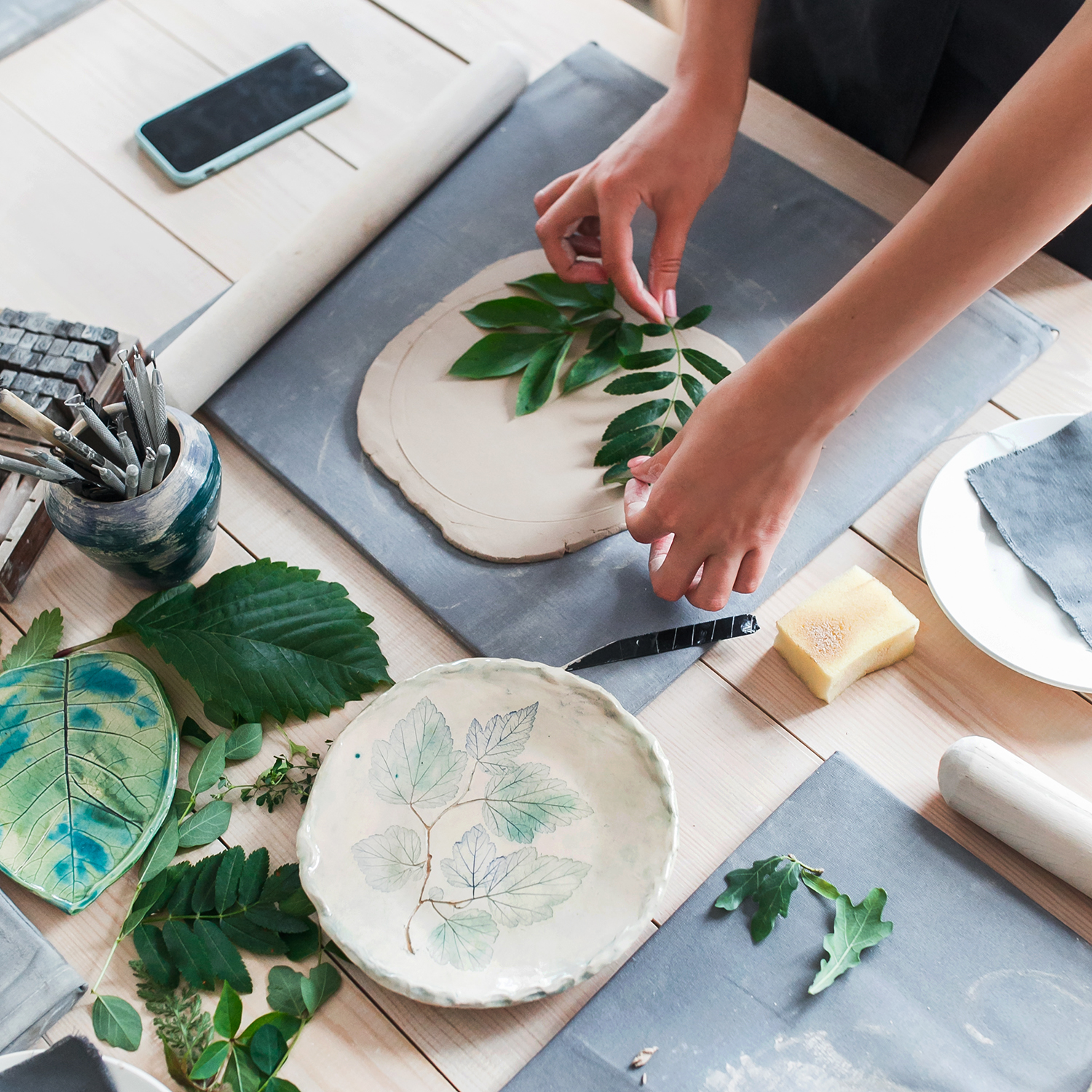 Мастер-класс очень простой, но время пролетает незаметно. Для того, чтобы сделать тарелку, нужно вначале от души простучать кусок глины, раскатать его ровномерно, тщательно проверить на возможные пузырьки воздуха. Потом загладить с двух сторон специальной пластинкой. Дальше самое творческое и интересное - придумываем узор, отпечатываем листья, кружева, штампики, фигурные скалки, все, что пожелаете!
